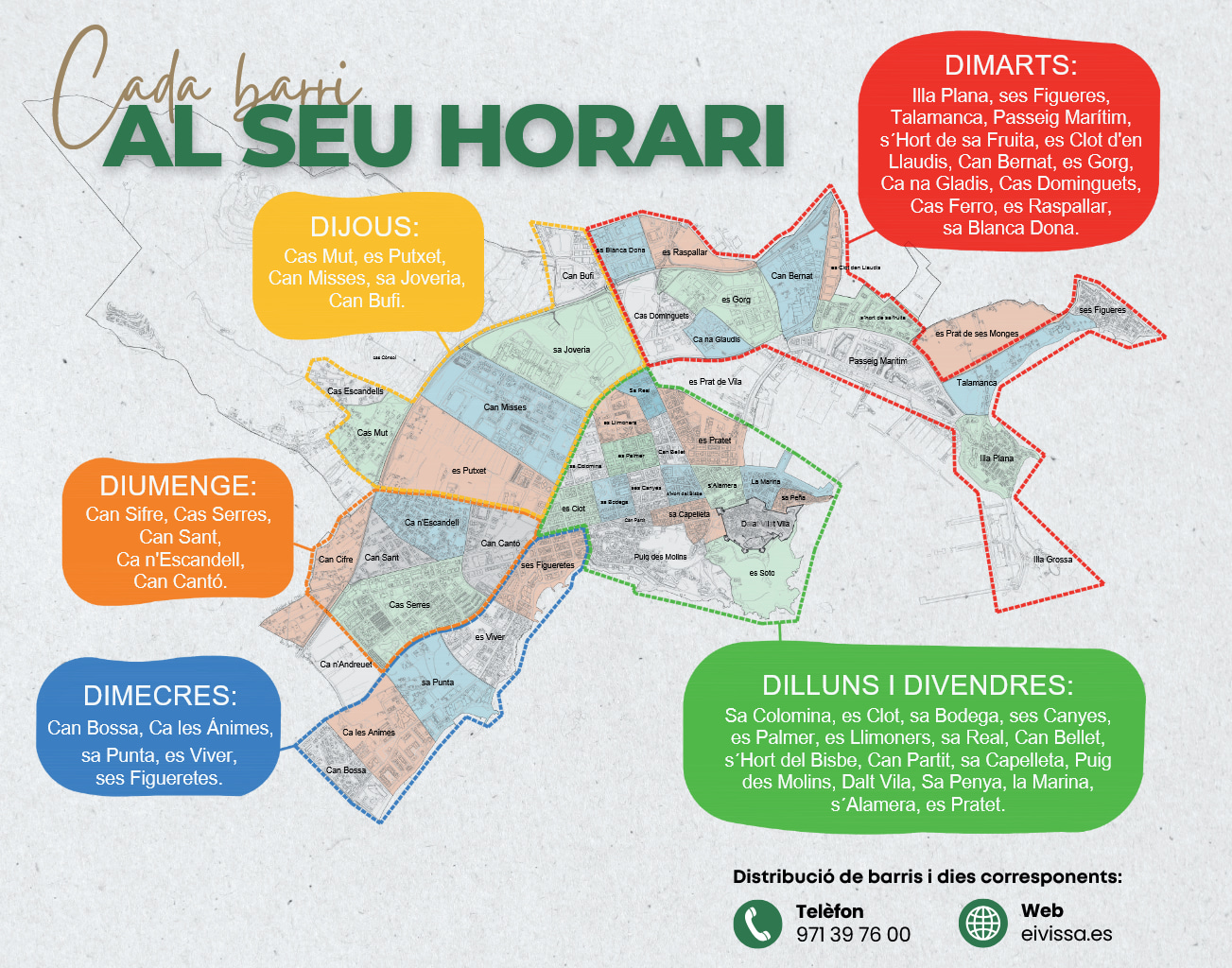 Lunes y viernes (verde): Sa Colomina, es Clot, sa Bodega, ses Canyos, es Palmar, ses Llimoners, sa Real, Can Bofí, s’Hort del Bisbe, Can Parisi, sa Capelleta, Puig des Molins, Dalt Vila, sa Penya, la Marina, s’Alamera, es Pratet.